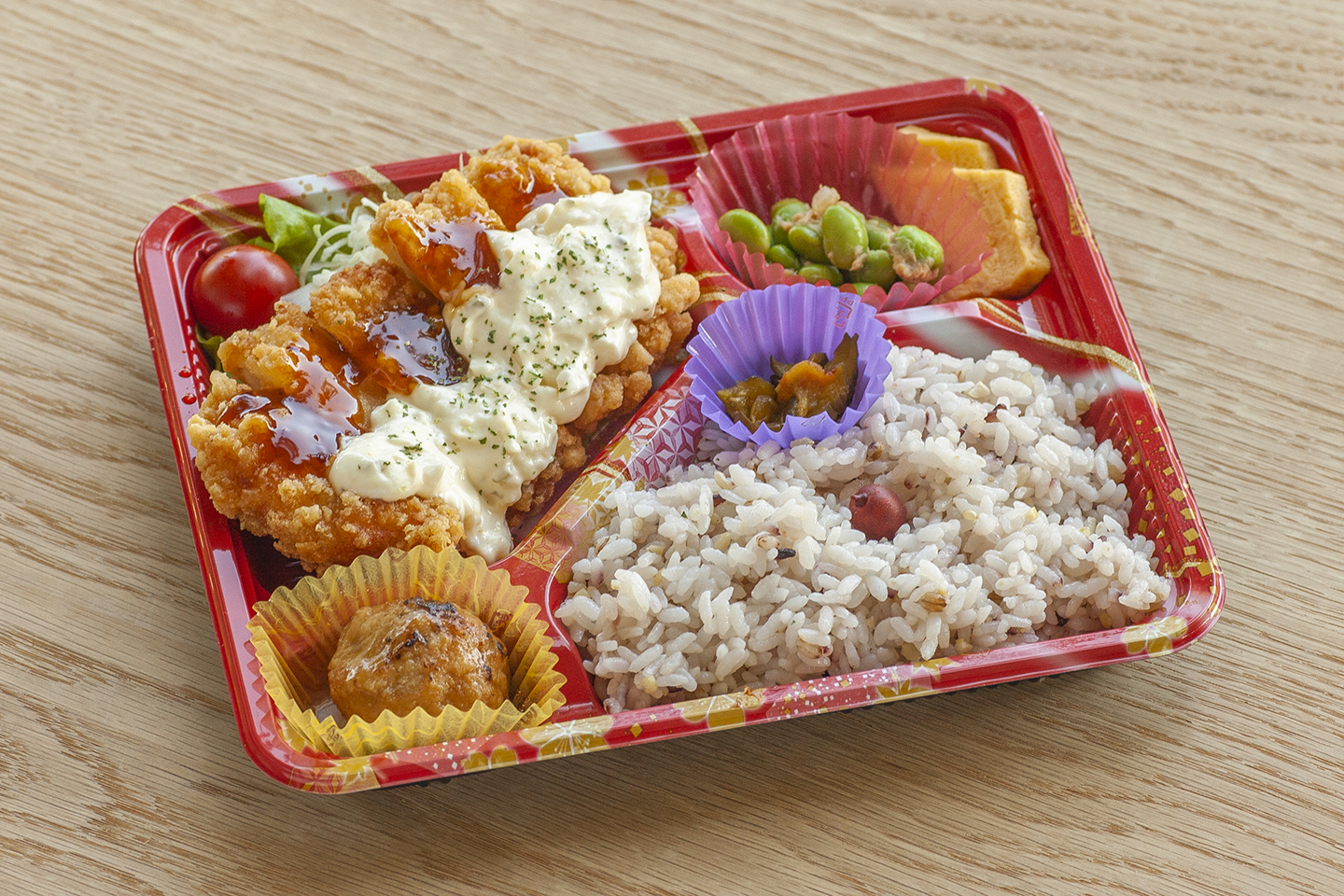 16穀米を使用し、日替わりで40品目7種類のおかずが入ったお弁当を、お好みのボリュームで選べます。